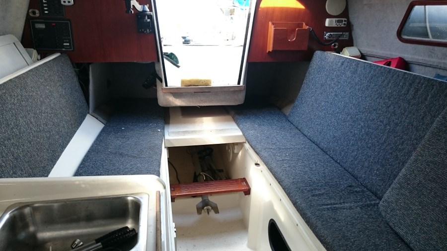 interior looking aft: slide out bunk just above the step