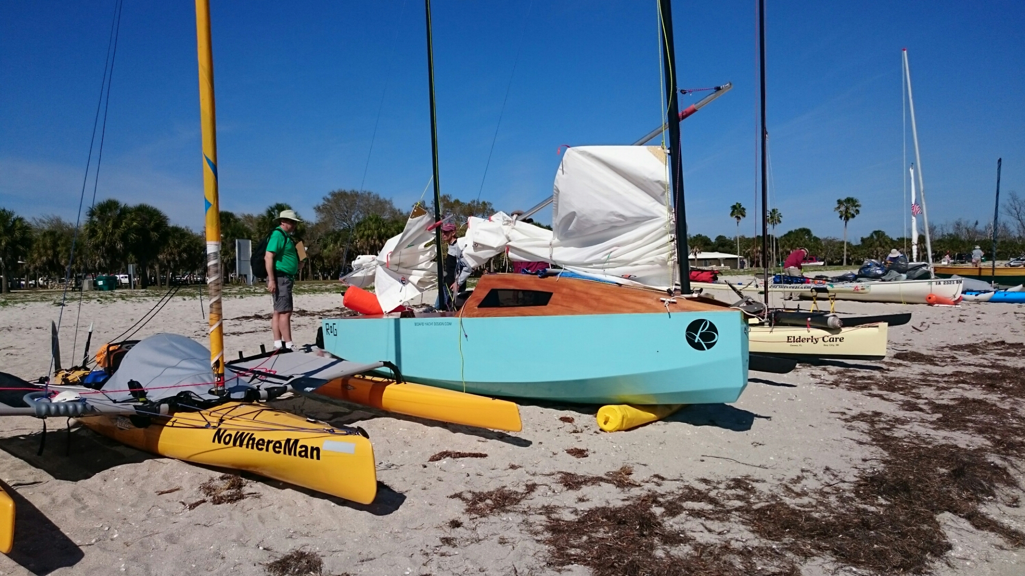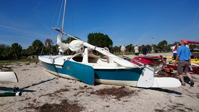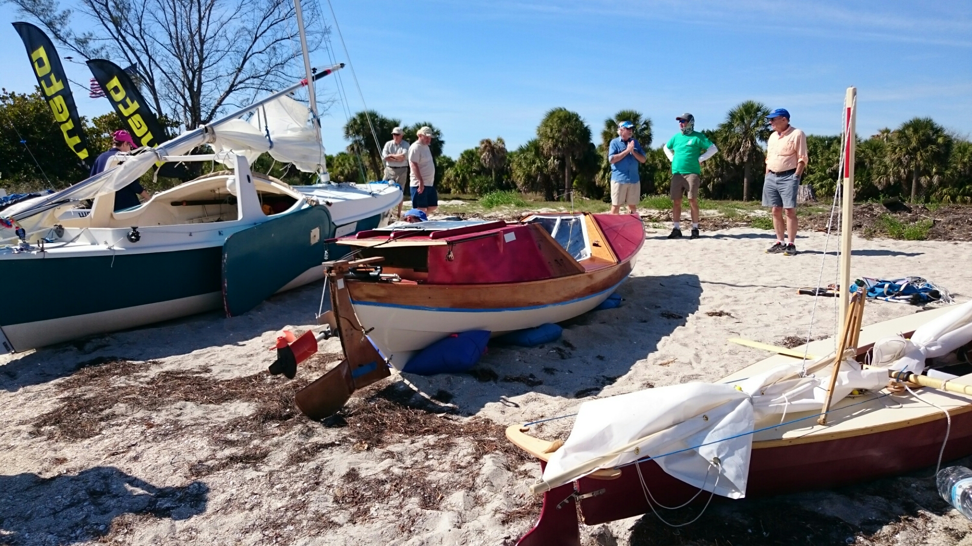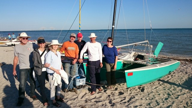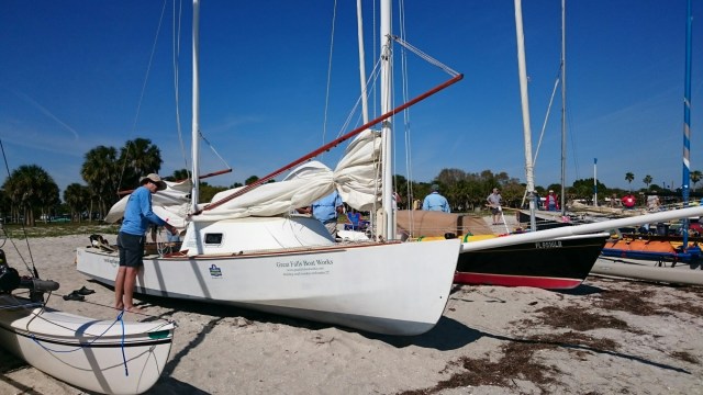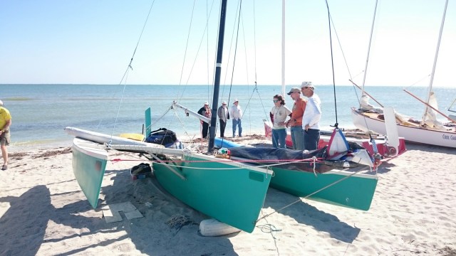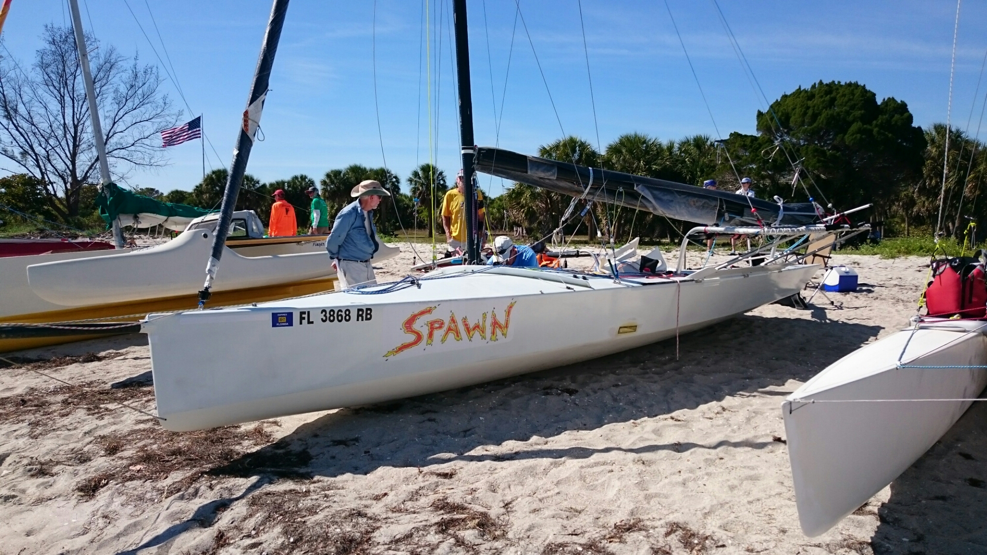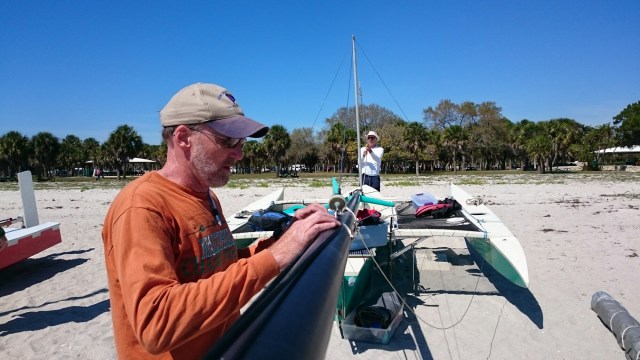 The tri came with heavy duty mast raising and lowering bars and a gin pole rig. The wind had come up but was blowing from behind us. The guys figured out how it all worked as the time ticked on.