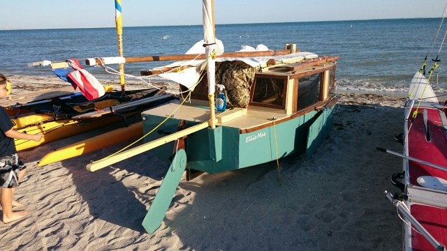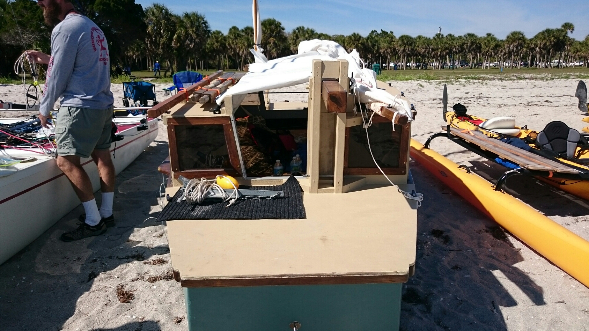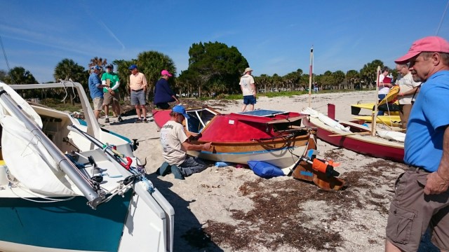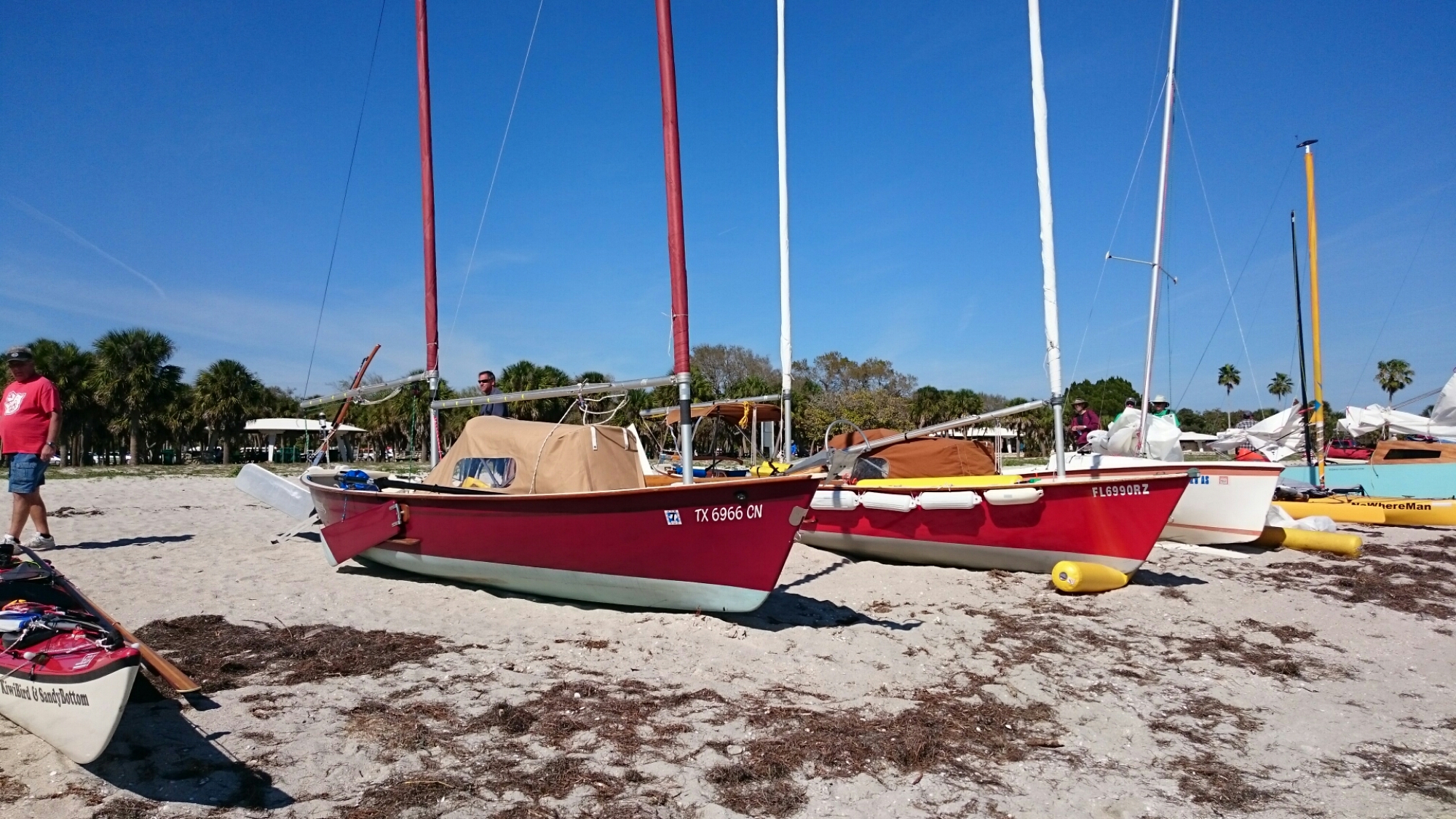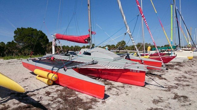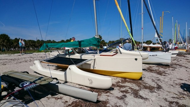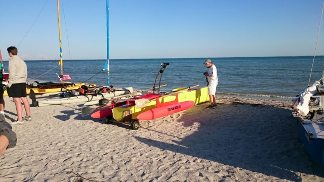 The tri came with heavy duty mast raising and lowering bars and a gin pole rig. The wind had come up but was blowing from behind us. The guys figured out how it all worked as the time ticked on.