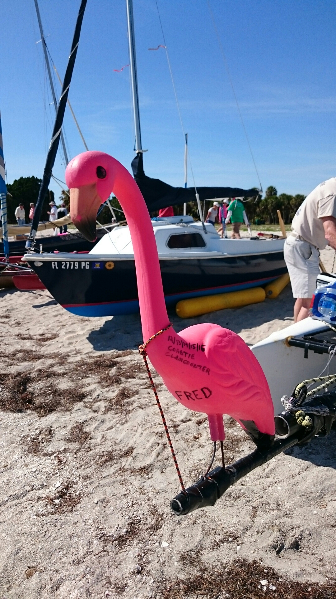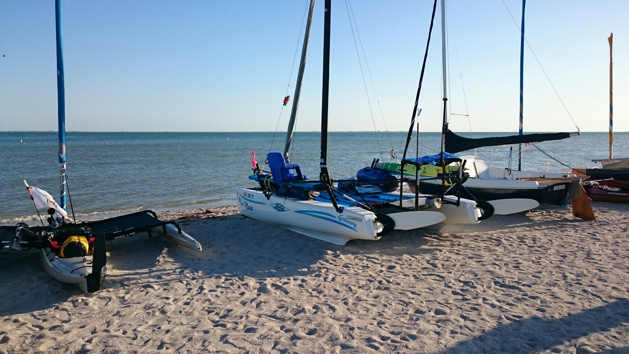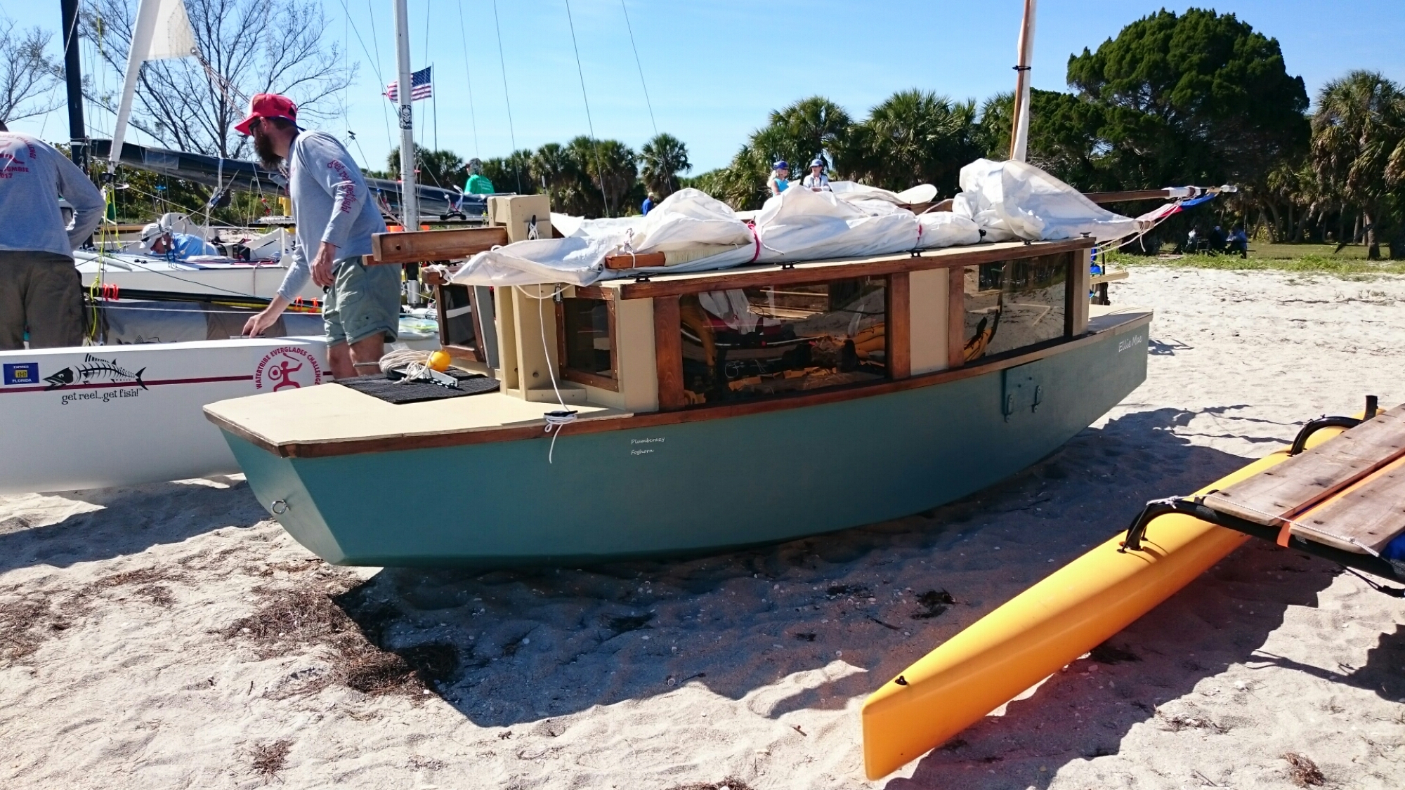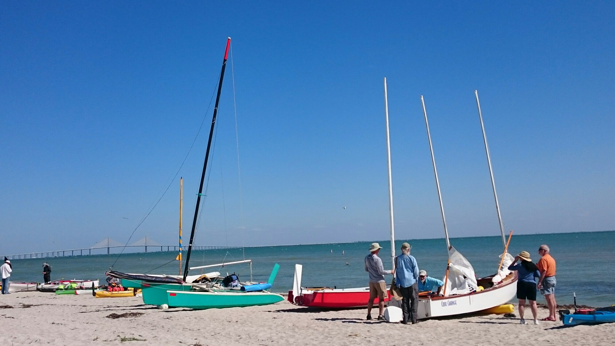 The tri came with heavy duty mast raising and lowering bars and a gin pole rig. The wind had come up but was blowing from behind us. The guys figured out how it all worked as the time ticked on.